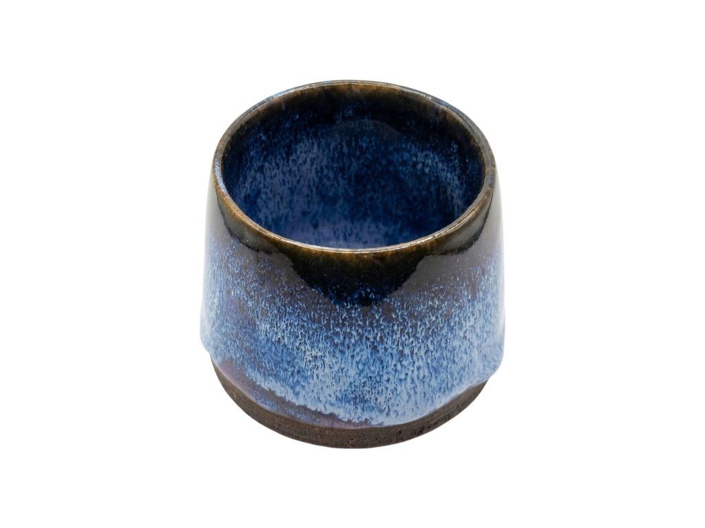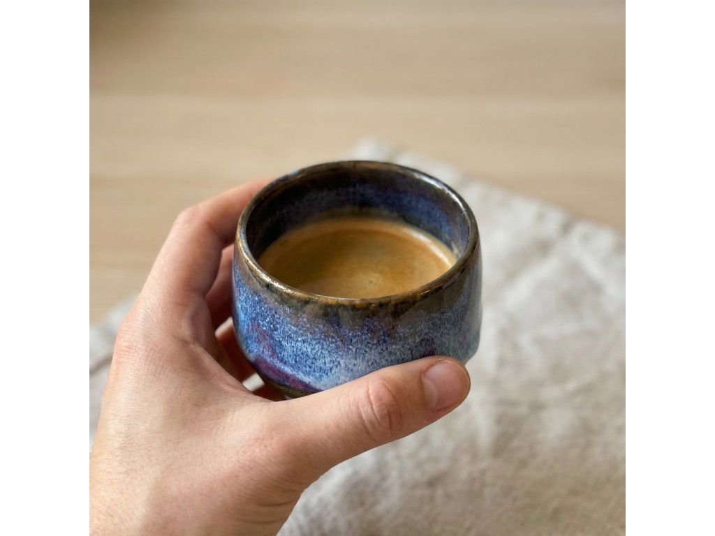 Ručně vyráběný keramický hrnek v malé velikosti, který zaujme svou hlubokou modrou glazurou s jemným přechodem do tmavého základu. Každý kus vzniká pomalu a nese vlastní kresbu – žádné dva nejsou stejné.