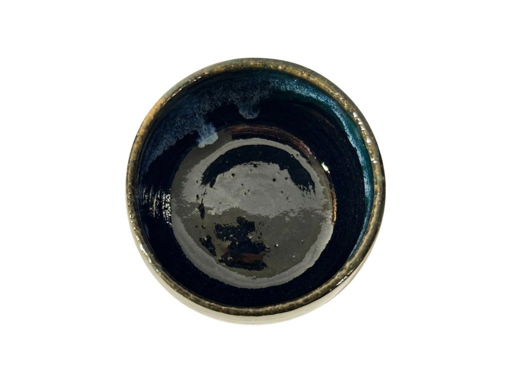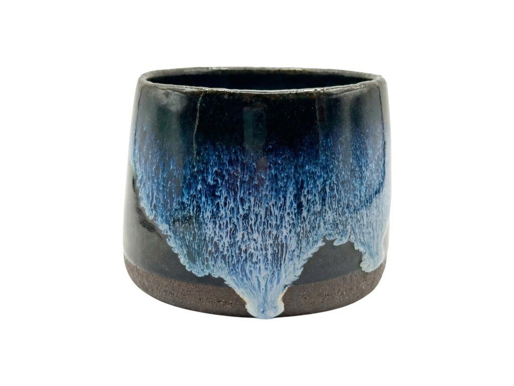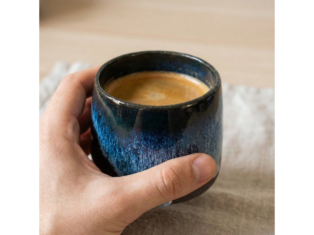 Ručně vyráběný keramický hrnek v malé velikosti s hlubokou modro-zelenou glazurou, která se postupně rozplývá do světlejší kresby. Efekt vzniká přirozeně při výpalu, takže každý kus je originál.